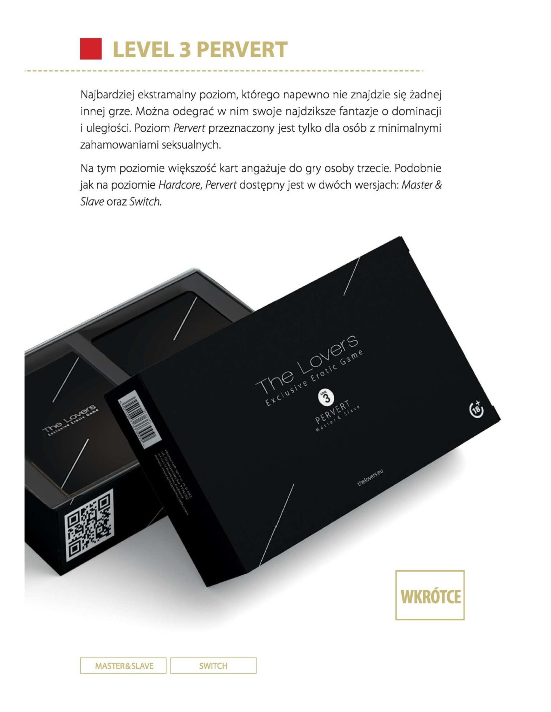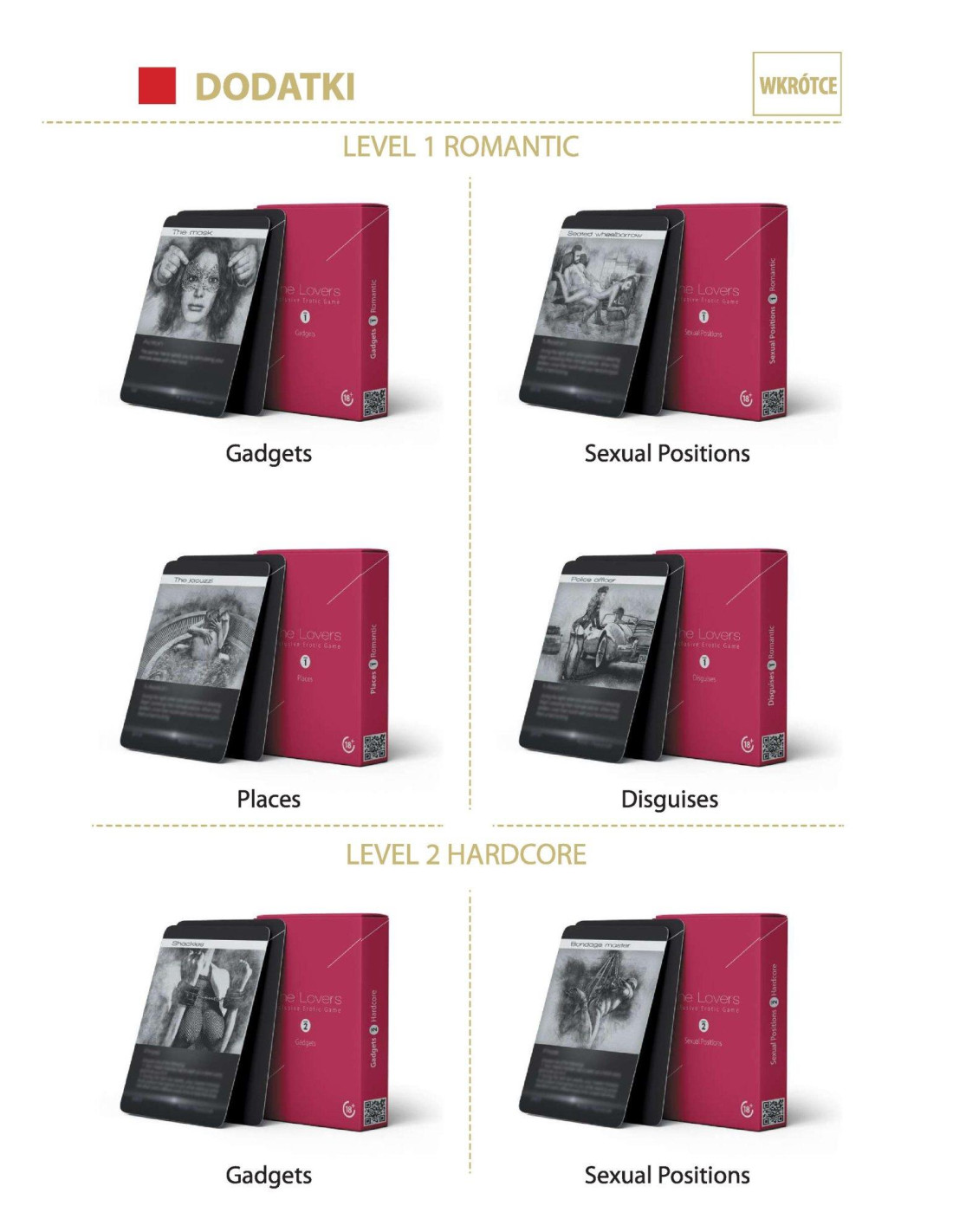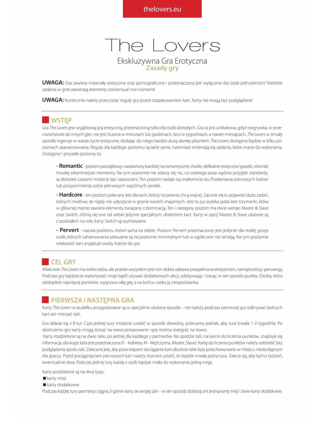 The LoversThe Lovers to wyjątkowa seria gier erotycznych tylko dla dorosłych. Ta seria jest wyjątkowa, ponieważ w przeciwieństwie do innych gier jej ukończenie nie zajmuje minut ani godzin, ale tygodnie, a nawet miesiące. The Lovers to gra, która niewątpliwie urozmaici Twoje życie seksualne. Kochankowie będą dostępni na kilku różnych poziomach. Zasady dla każdego poziomu są takie same, ale im wyższy poziom, tym trudniejsze zadania.