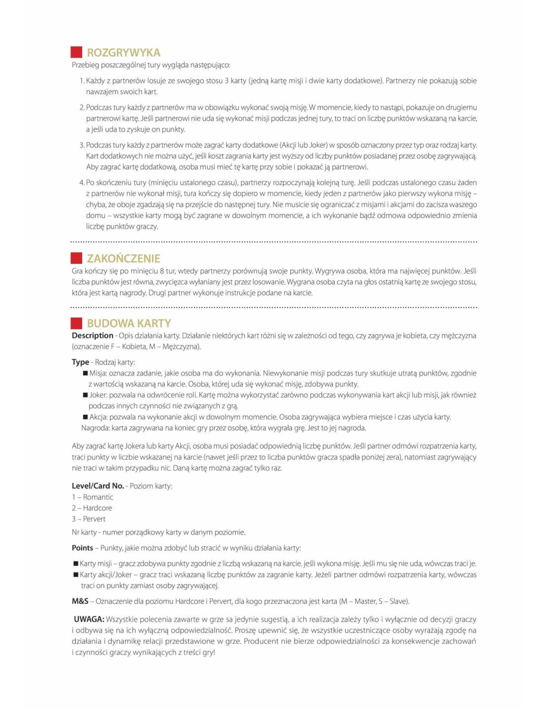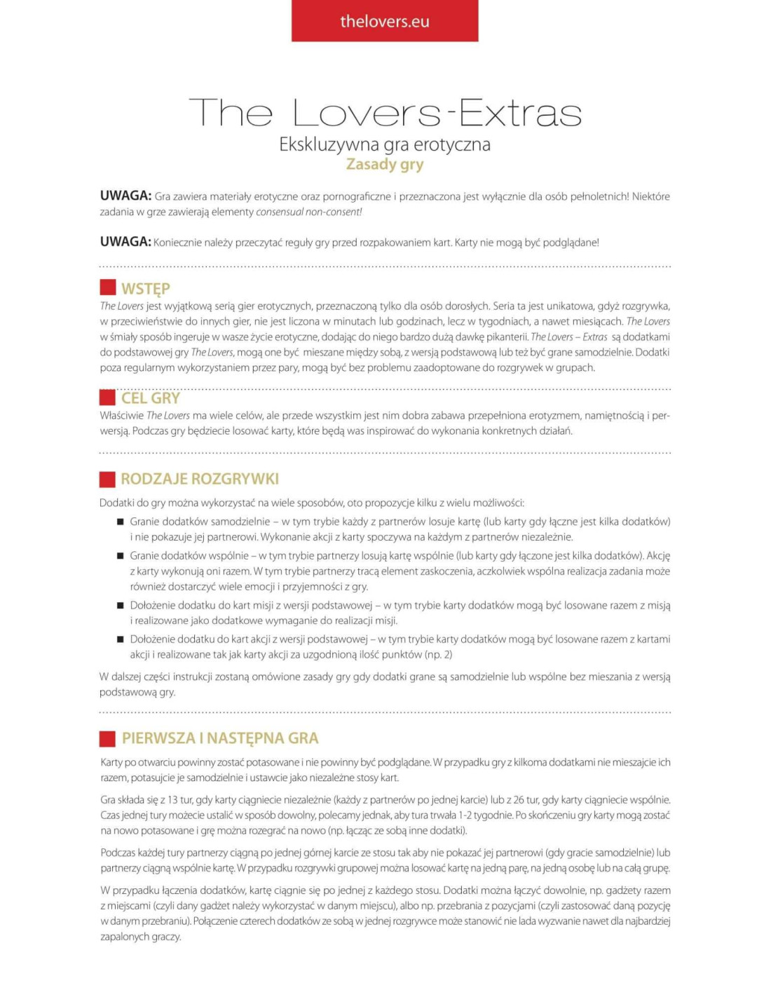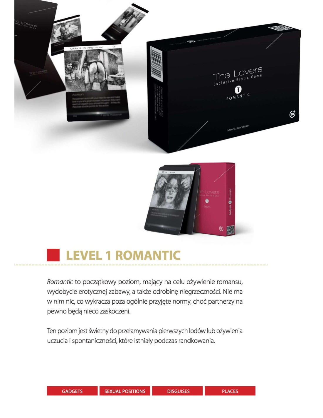 The LoversThe Lovers: Exclusive Erotic Game - Level 1 - Romantic jest wyjątkową grą erotyczną, przeznaczoną tylko dla osób dorosłych. Gra jest unikatowa, gdyż rozgrywka w przeciwieństwie do innych gier, nie jest liczona w minutach lub godzinach, lecz w tygodniach, a nawet miesiącach. The Lovers wymaga dużego zaangażowania oraz w śmiały sposób ingeruje w Wasze życie erotyczne, dodając do niego bardzo dużą dawkę pikanterii. Dodatkowym walorem gry są erotyczne grafiki przygotowane dla każdej karty.