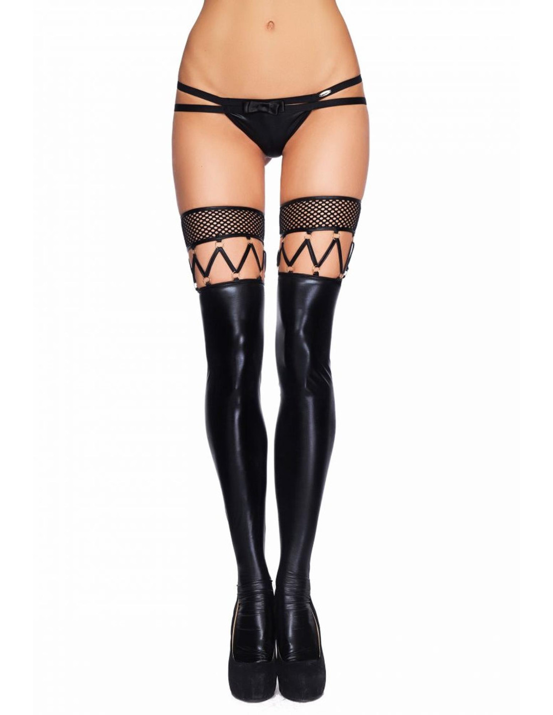 Absolutnie niepowtarzalne i jedyne w swoim rodzaju fantazyjne pończochy z połyskliwego wet-looku ozdobione niezwykle oryginalnym przeplataniem i wykończone w górnej części pasem kabaretki. Ekskluzywność produktu podkreślają złote okucia