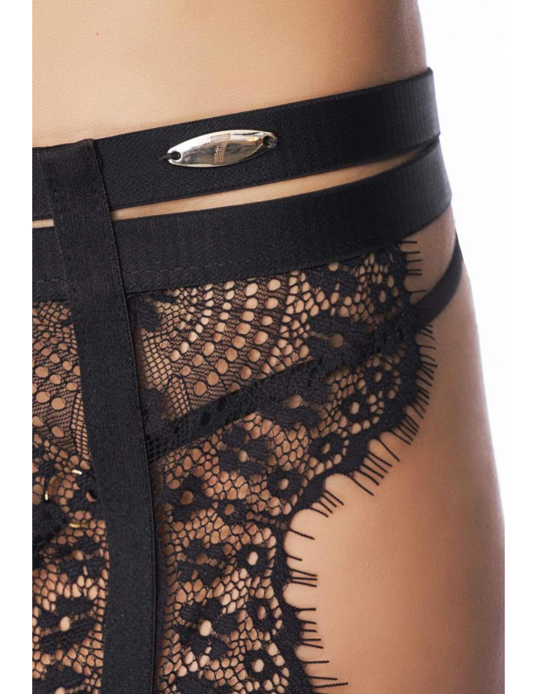 Wyjątkowy zmysłowy pas do pończoch, bardzo prosty w formie, ale niezwykle seksowny, kipiący wręcz erotyzmem. To znakomite połączenie prześlicznej koronki i podwójnej gumki, ozdobione złotymi okuciami i blaszką z logo. Żabki metalowe. W komplecie z pończochami.