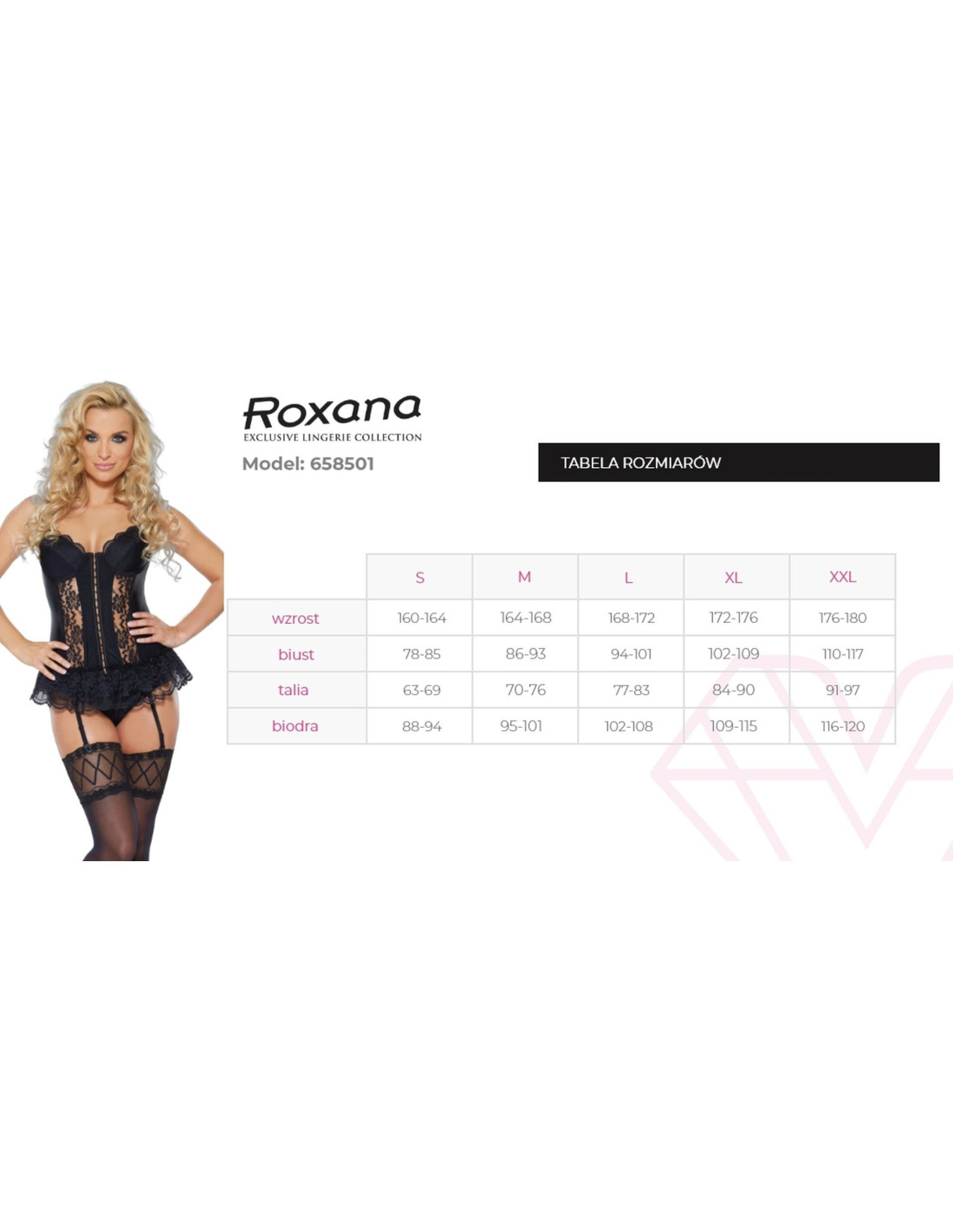 Erotyczny a zrazem bardzo kobiecy gorset marki Roxana sprawi, że Twoja nocna stylizacja będzie wyjątkowa. Koronkowy gorset idealnie łączy elegancki, satynowy materiał z lekkim połyskiem z delikatną i kobiecą koronką. Bardzo kobieca koronka na dole gorsetu sprawia, że ten komplet bielizny erotycznej przywodzi na myśl eleganckie stroje wprost z rewii w Moulin Rouge. Stań się seksowną kusicielką i gwiazdą burleski! Gorset oprócz pięknej koronki ma również modelujący stanik z fiszbinami, który idealnie unosi piersi, nadając im pożądany wygląd. Zapięcie z przodu na haftki znacznie ułatwia jego zakładanie. Z tyłu gorset posiada wiązanie, którym można regulować szerokość kreacji. Do kompletu dołączone są seksowne stringi o wygodnym kroju. Całość idealnie dopełniają paski, do których można przypinać pończochy. To idealny komplet dla fanek romantycznego i jednocześnie pikantnego stylu.
