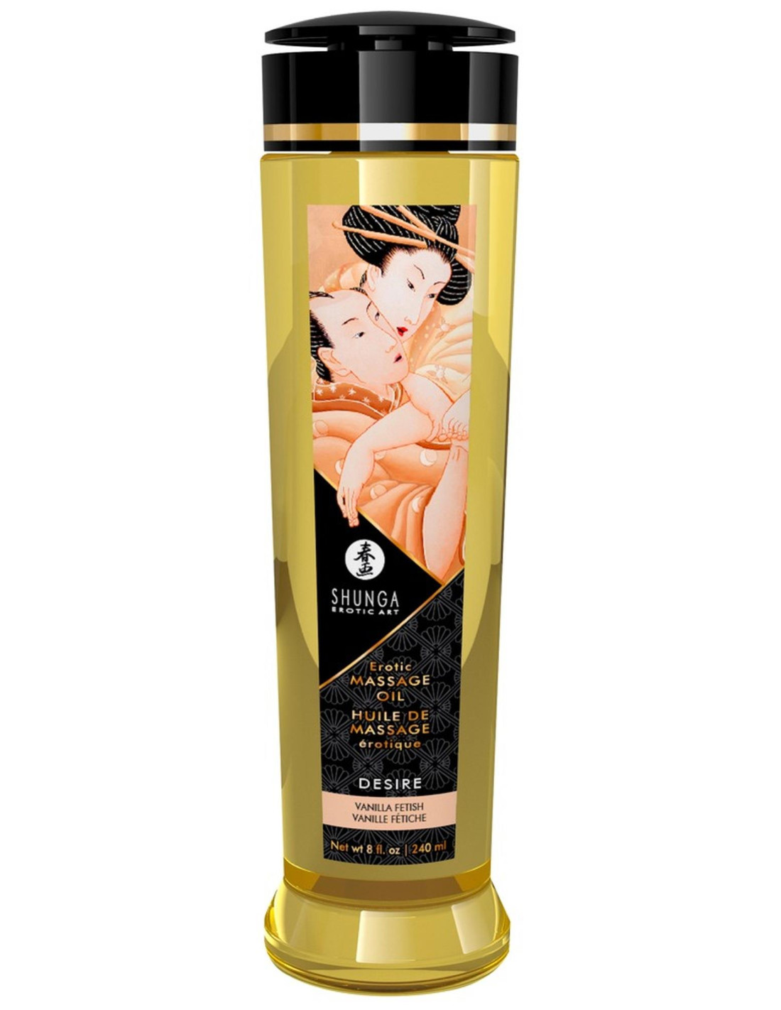 Luksusowy Erotic Massage Oil Desire od Shunga o zmysłowym zapachu wanilii, który pobudza zmysły podczas masażu solo lub partnerskiego i sprawia, że chcesz więcej! Wegański olejek do masażu wykonany jest w 100% z naturalnych olejów tłoczonych na zimno i zawiera pielęgnującą skórę witaminę E. Delikatnie i łatwo przesuwa się po skórze, nie pozostawiając nieprzyjemnego tłustego uczucia ani pozostałości. Wręcz przeciwnie, pozostawia skórę jedwabiście miękką! Ponadto jest bardzo bogaty dla wielu zmysłowych i namiętnych masaży całego ciała.